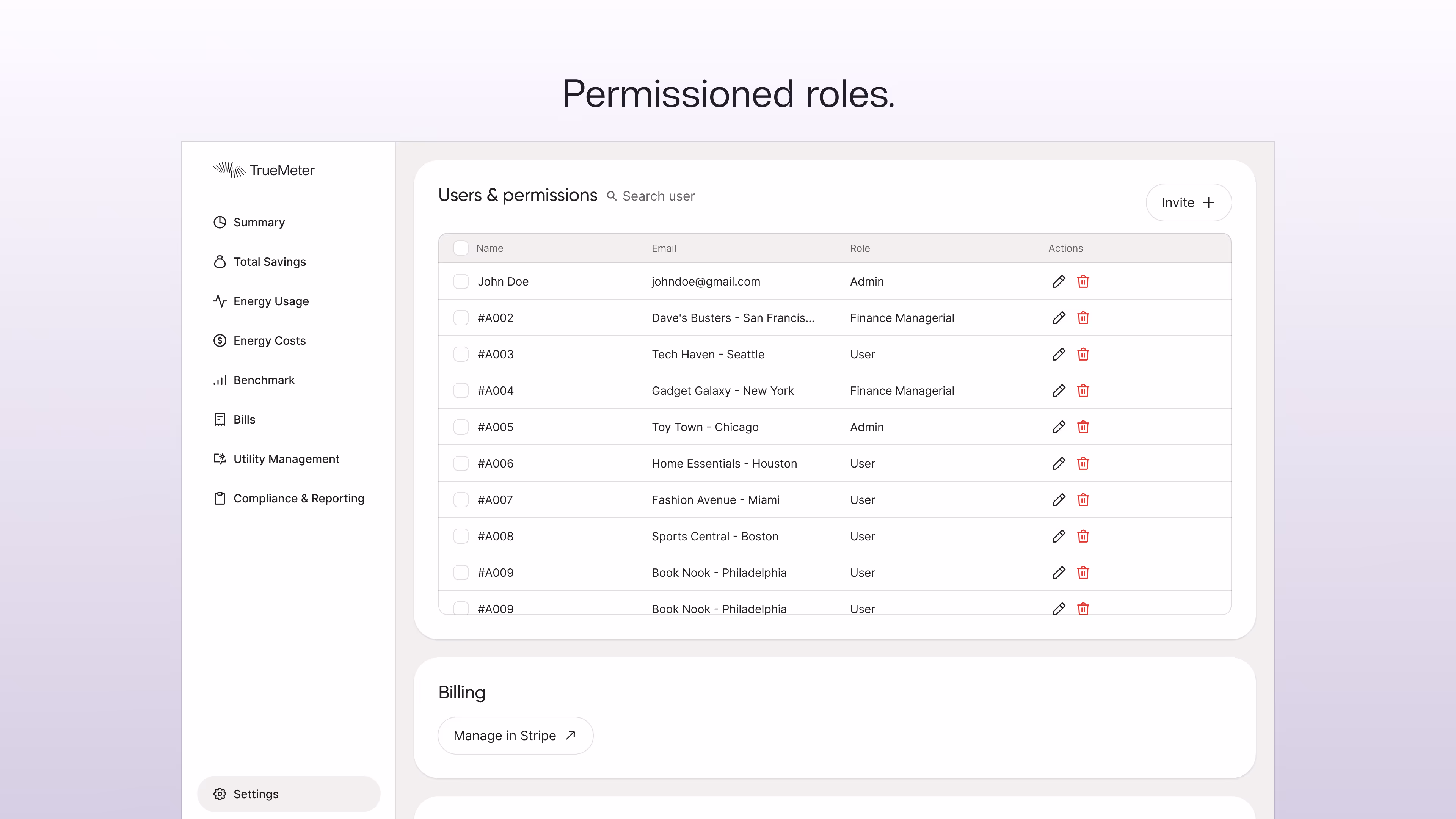 TrueMeter’s dashboards aren’t just about energy insights — they also give companies control over who can access what. With user permissions, finance teams, operators, and auditors can be invited with specific roles and access levels, ensuring the right people see the right data without compromising security.
